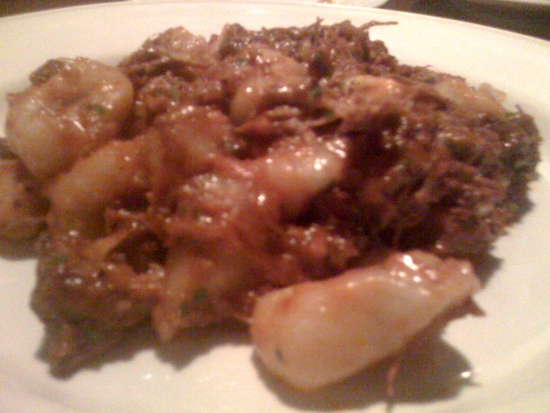 Was torn last night as to where to go with spouse for dinner. Really wanted the spaghetti and meatballs with chili oil, at Justa Pasta, but emailed Chef Roland and he said it would not be on the menu that night (very cool of the Chef to email-chat with a peasant such as myself). So, we ended up going to Pazzo, downtown on Broadway. Had read how Chef John Eisenhart had been sous chef at Mario Batali’s Babbo, in Manhattan’s West Village, and the NYC connection seemed timely for us. Slipped a note into our online reservation, and sure enough the maître d’ gave us a cozy and romantic booth where we could see the kitchen action but still be alone. Our waitress was attentive, and helped me order a split-plate of two full course items I was stuck on.