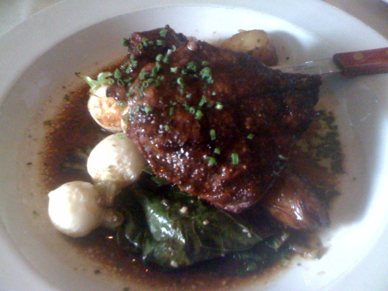 Always a good meal here, so much so that—for me—it is a special event sort of place. Love how you can see the kitchen right in the heart of the restaurant. Love the windows. The cozy feel to the whole joint. Enjoyed some wine, had a nice mixed salad with blue cheese crumbles, devoured some oysters on the half shell, then sat back for the Main Show: A flat iron steak with baby turnips and fingerling potatoes…Oh my. It was a great meal. Love Higgins.