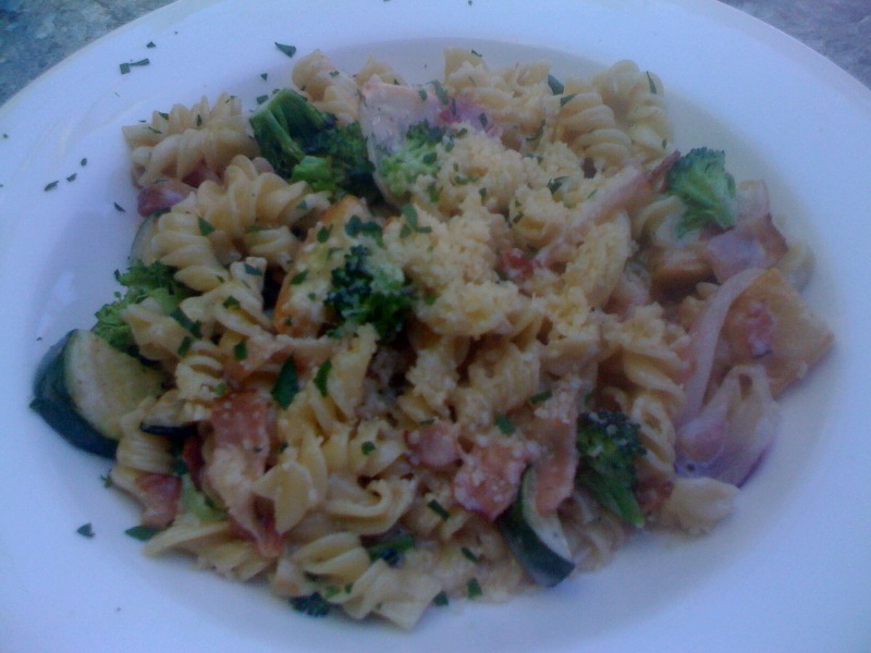 Had the pasta today, and it was good. Fusili with smoked bacon, red onion, zucchini, yellow squash, broccoli, garlic, and white wine cream sauce. This picture does not do it justice, I know, I know, it looks like a spam plate lunch in the Waipahu Indistrial Park (Been there, done that). Trust me, it did tatse good! Anyways, got there early and ate outside enjoying the clear sky and sunshine. If I could curl up and take a nap under my desk now (George Costanza style) the world would be perfect.