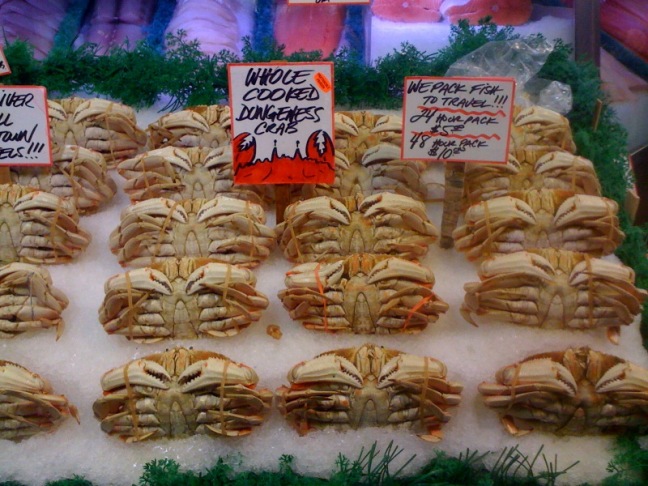 There are few things I like better than fresh seafood, and at the top of the pack is Dungeness crab. Great memory from years back was eating a bunch of crabs at the coast, with some work buddies, outside on a deck, cool ocean breeze, cold micro brew, crab dripping down your forearm, just loving it. I need more crab.