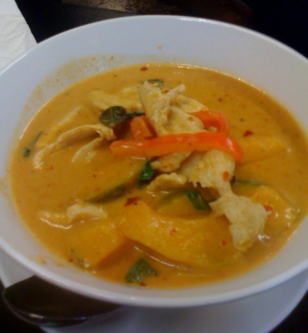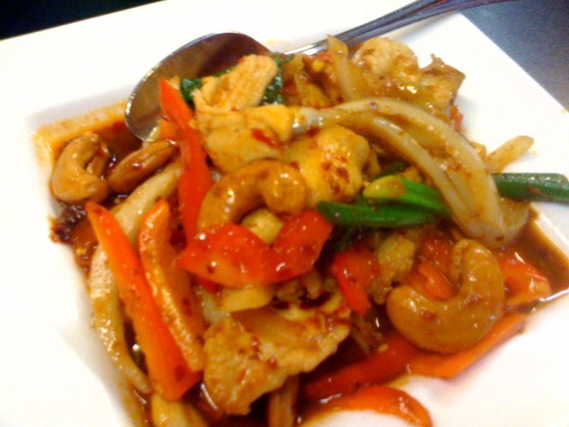 Today I had the Pad Cashew Chicken with sautéed onions, carrots, garlic, cashew nut, oyster sauce, bell peppers & chili paste. My first time. Very good, but I ordered too many “stars” of heat and my mouth was on fire. I started crying it was so hot, and coming from me that is saying a lot. Lunchmate had the pumkin curry, which is also very good!