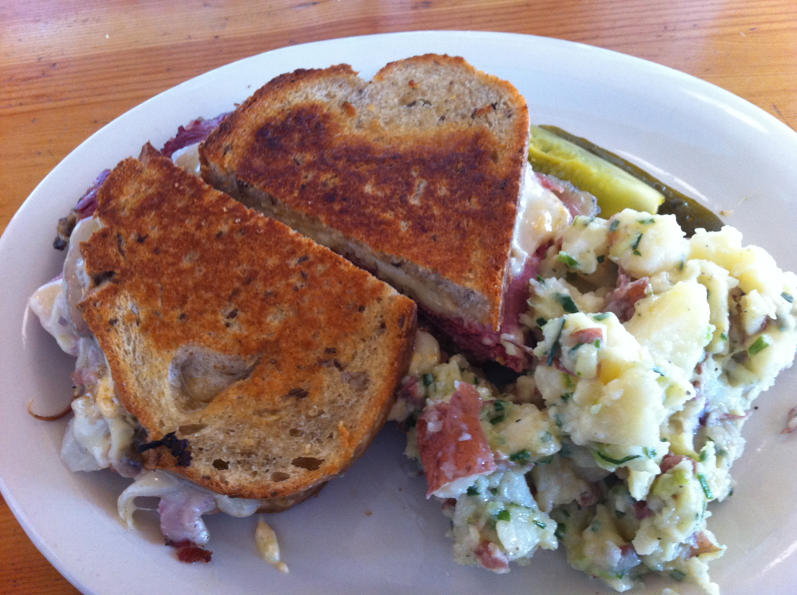Lunch Kenny & Zuke’s Posted by Me on August 22, 2011 Pastrami Reuben grilled with kraut, cheese & Russian dressing. Pickles and potato salad. Wow. Sat at the bar and watched the kitchen…Place was full of activity and the sandwich was incredible. Share this: Click to share on Facebook (Opens in new window) Facebook Click to share on X (Opens in new window) X Like Loading... Related