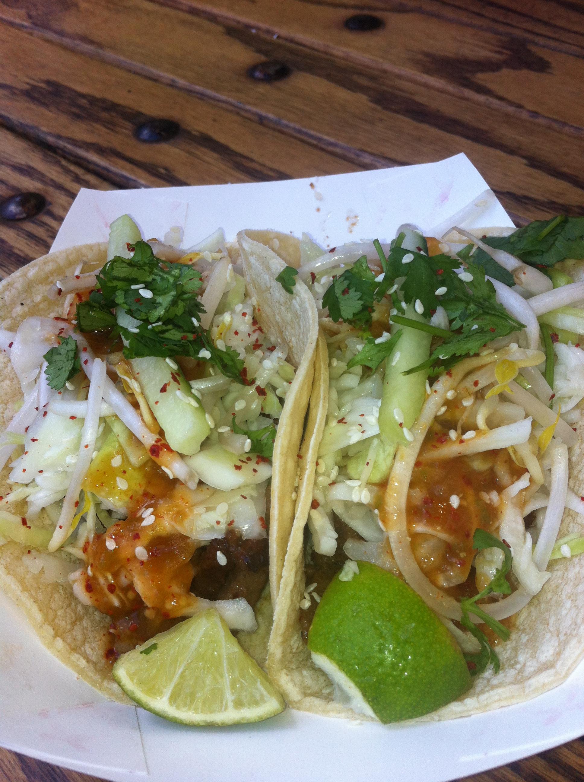 Lunch KOi Fusion Posted by Me on August 22, 2012August 22, 2012 These little tacos are awesome. Marinated pork with cabbage slaw, pico de gallo, cucumber spears, bean sprouts and cilantro in a soft corn tortilla. Sweet and spicy. Yum! Share this: Click to share on Facebook (Opens in new window) Facebook Click to share on X (Opens in new window) X Like Loading... Related